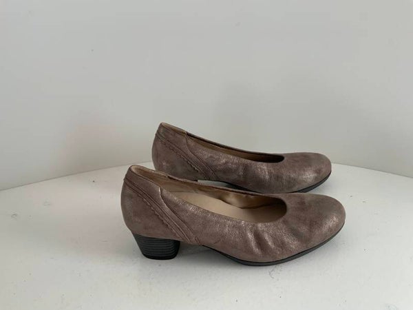 Yoyoli Durea 5H (38H) bruine goude metallic 278)Gemaakt van leer nubuck, gevoerd van leer uitnembaar zooltje ,Met voetbed van leerHaakhoogte 4,5 cm