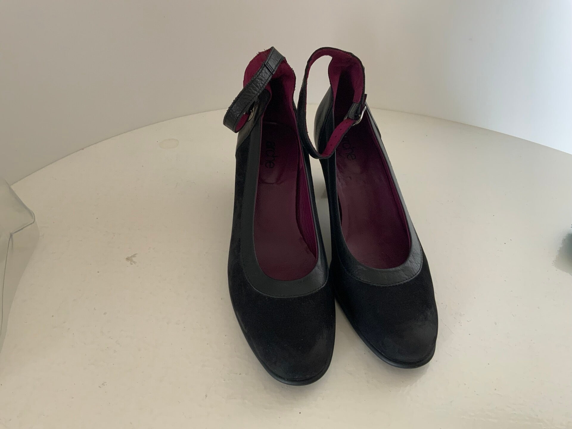 Merk Arche Hakvorm Hakhoogte 6,5 cm Kleur zwarte Binnenvoering leerMateriaal leerSluiting band met gesp Zooltje vast