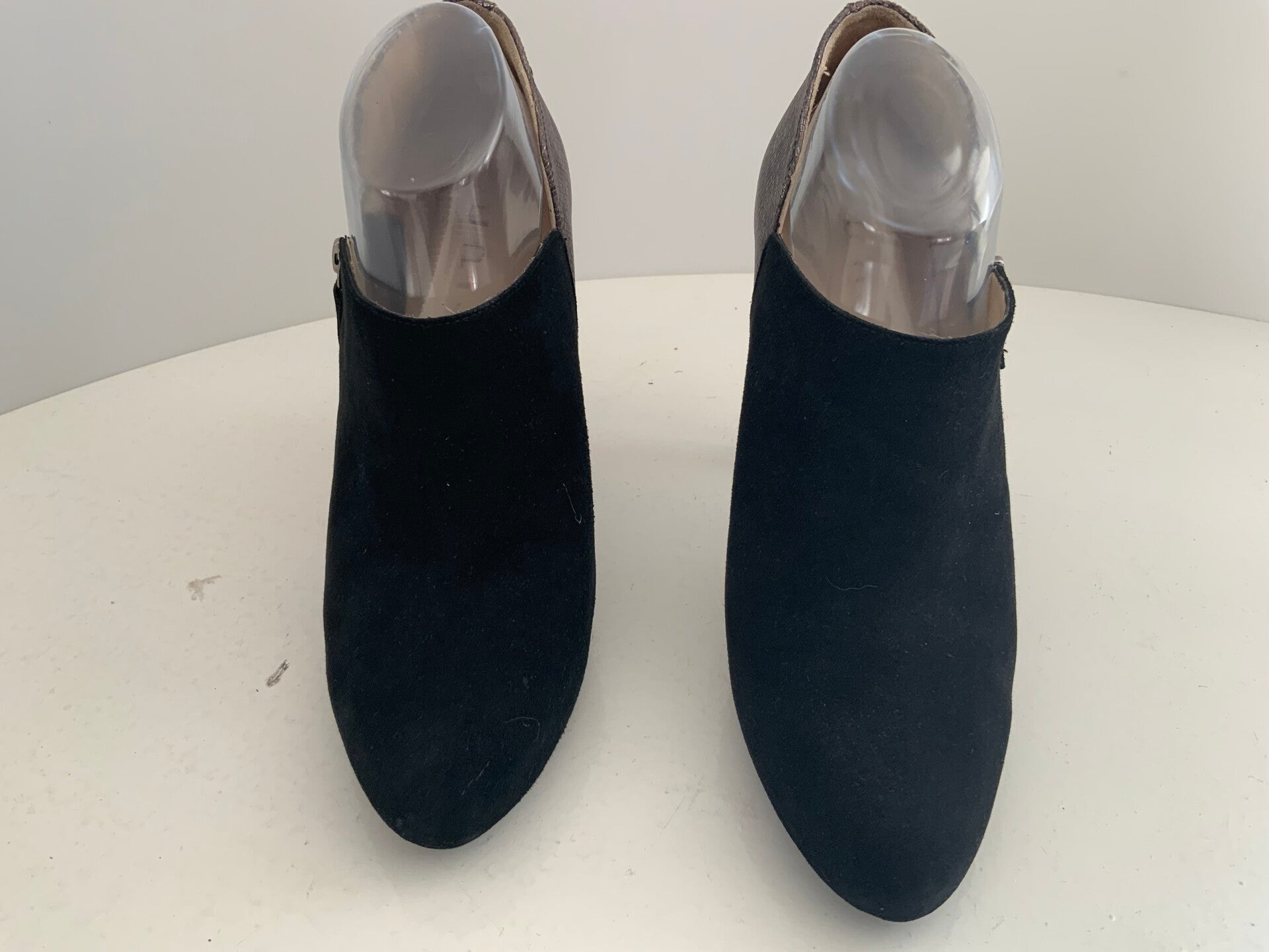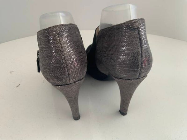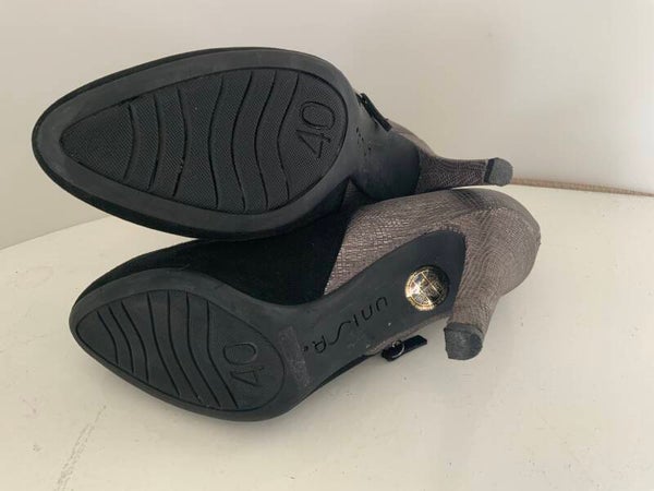 Merk UnisaHakhoogte 11 cmKleur zwart en zilver kleurBinnenvoering leerMateriaal suede voorin achterkant reptilesprintSluiting zijkantritsZooltje