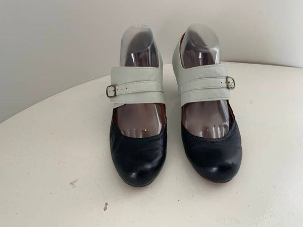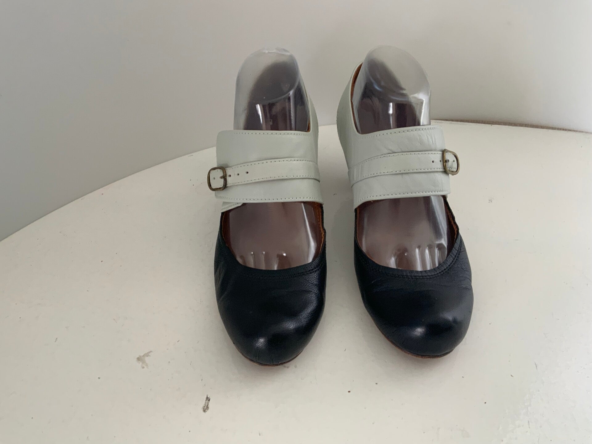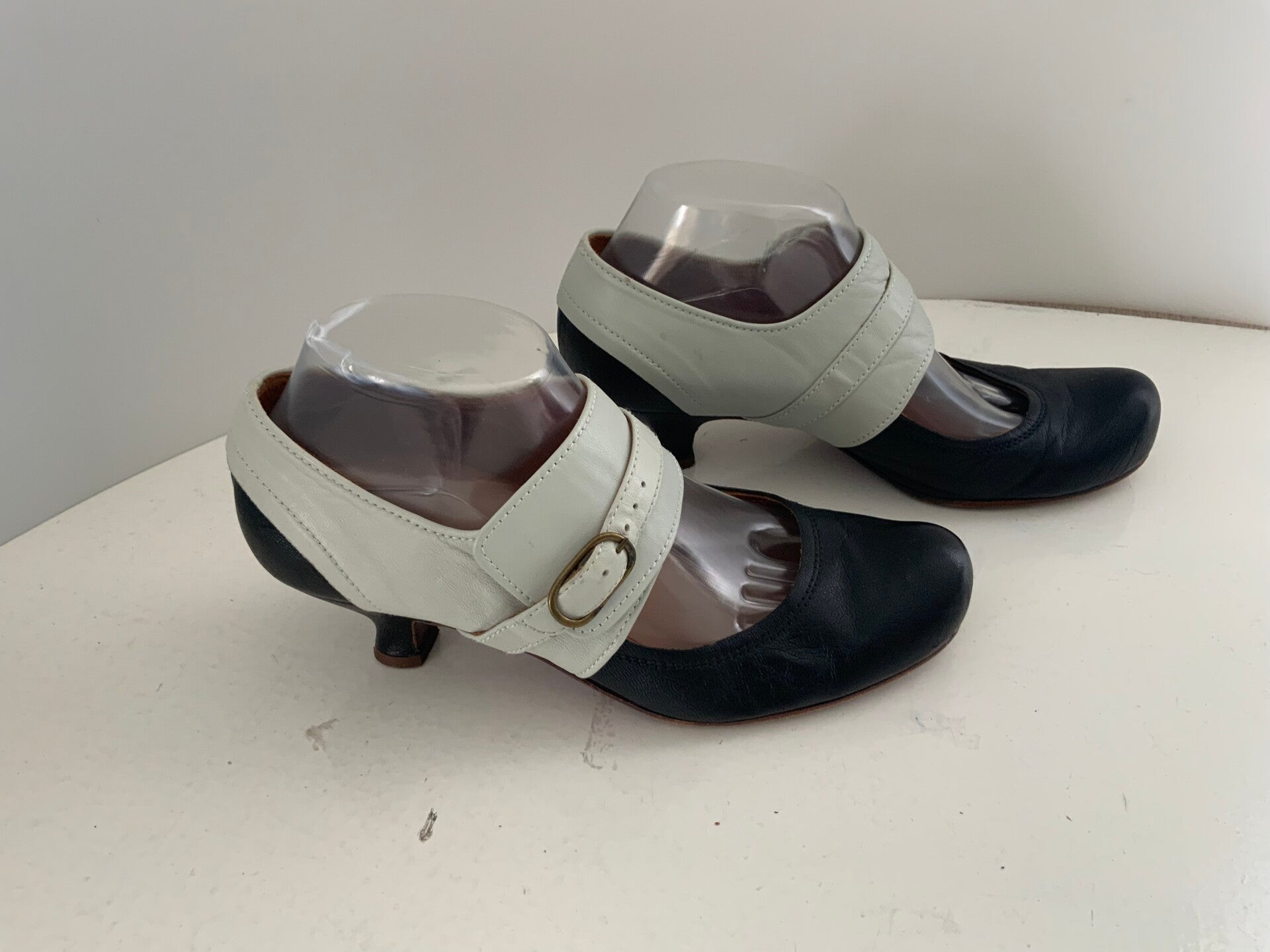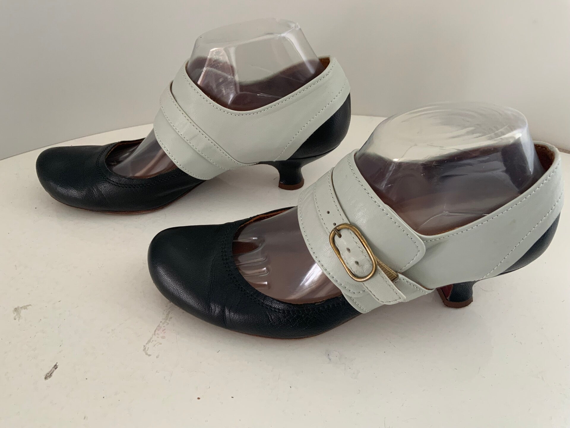 Chie Mihara 38,5 zwarte en licht grijs leren 408)Merk Chie MiharaHakhoogte 5,5 cmKleur zwart en licht grijsBinnenvoering leerMateriaal leerSluiting klittenband +riem met gespZooltjes