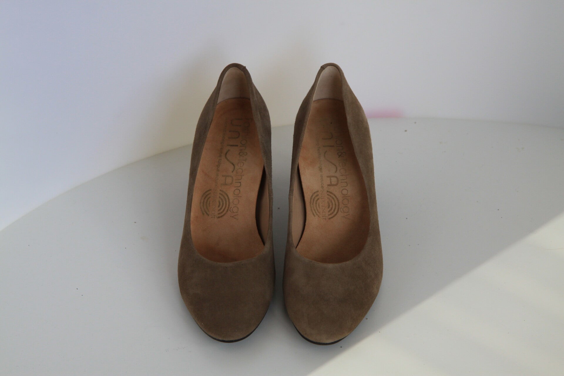 209) Unisa 38 lichtbruine suede pumps Hij is uitgevoerd in zacht en soepel licht bruine suède met een leren binnenvoering en een uitneembaar voetbed ook gevoerd van leer De blokhak is bijna 6,5 cm hoog.