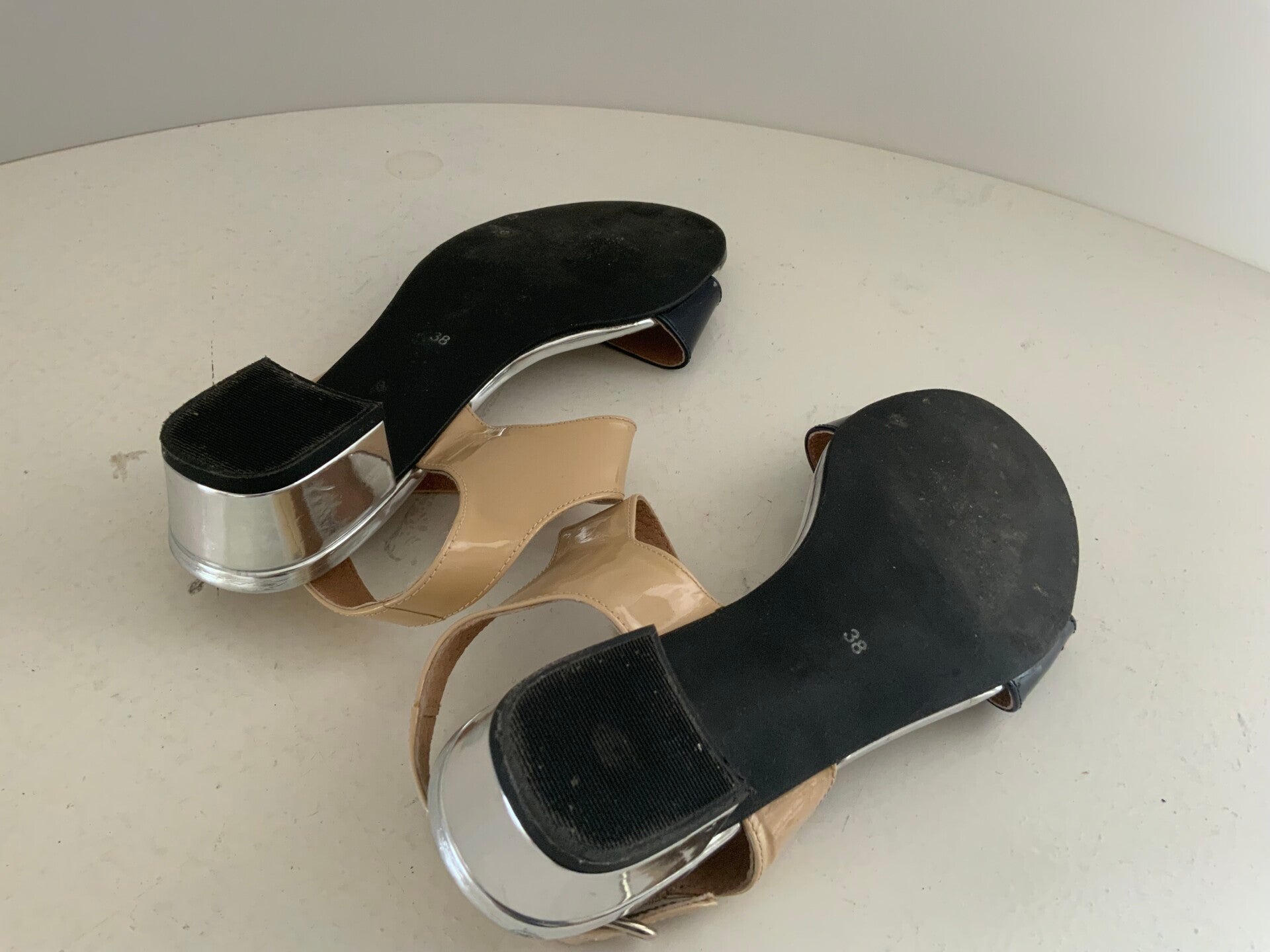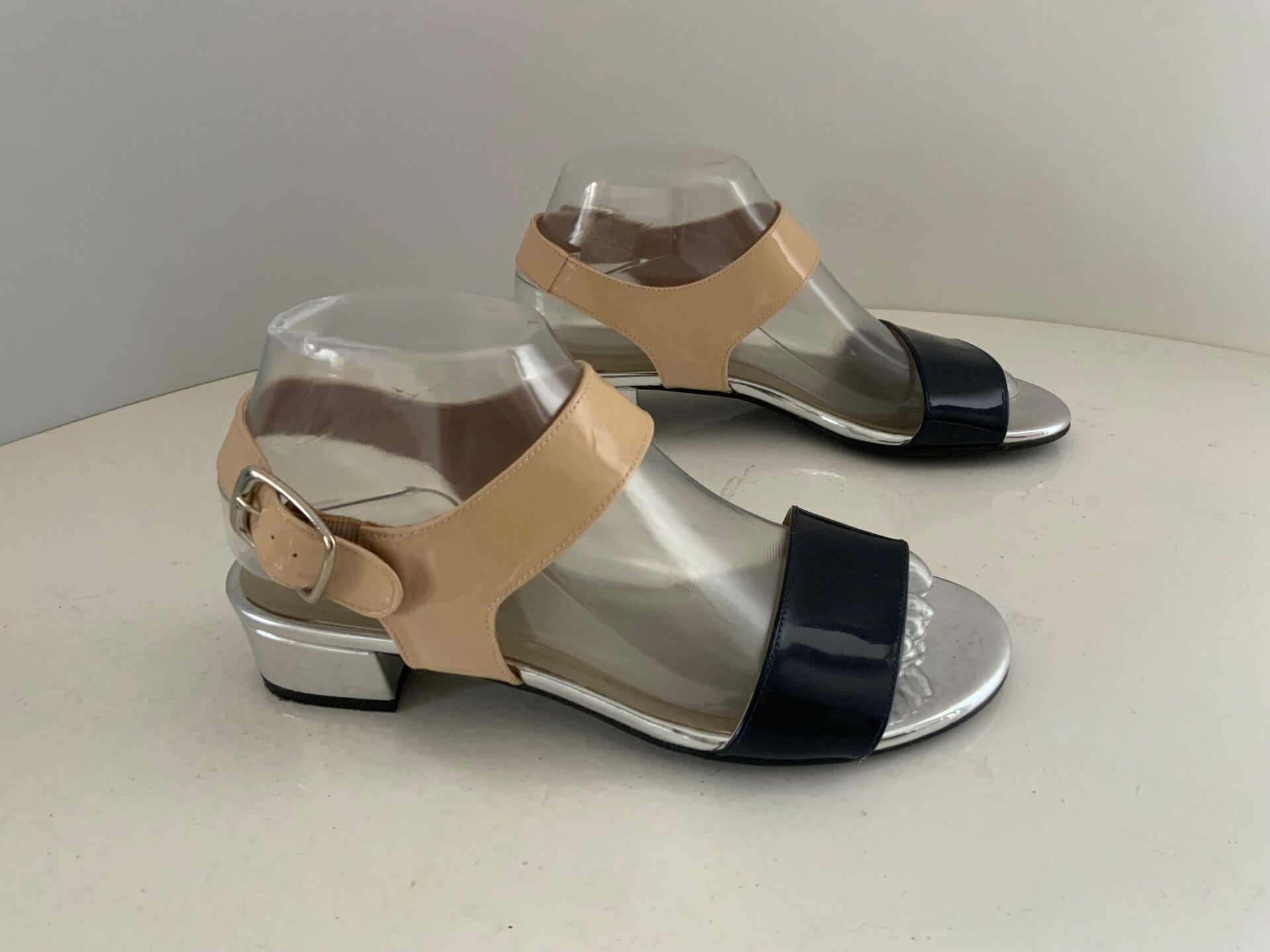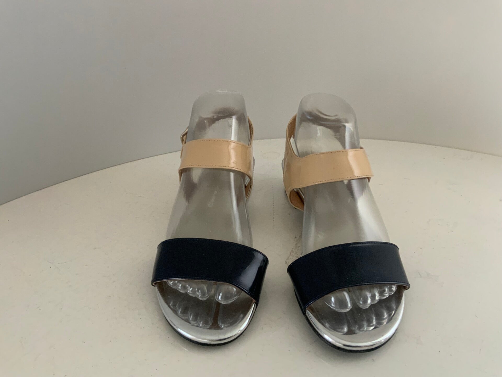Dit zijn sandalen van het Spaanse merk Brenda Zaro, bekend om hun elegante ontwerpen en kwalitatieve materialen. Dit specifieke model een combinatie te zijn van blauw en beige lakleer met een opvallende zilveren blokhak.