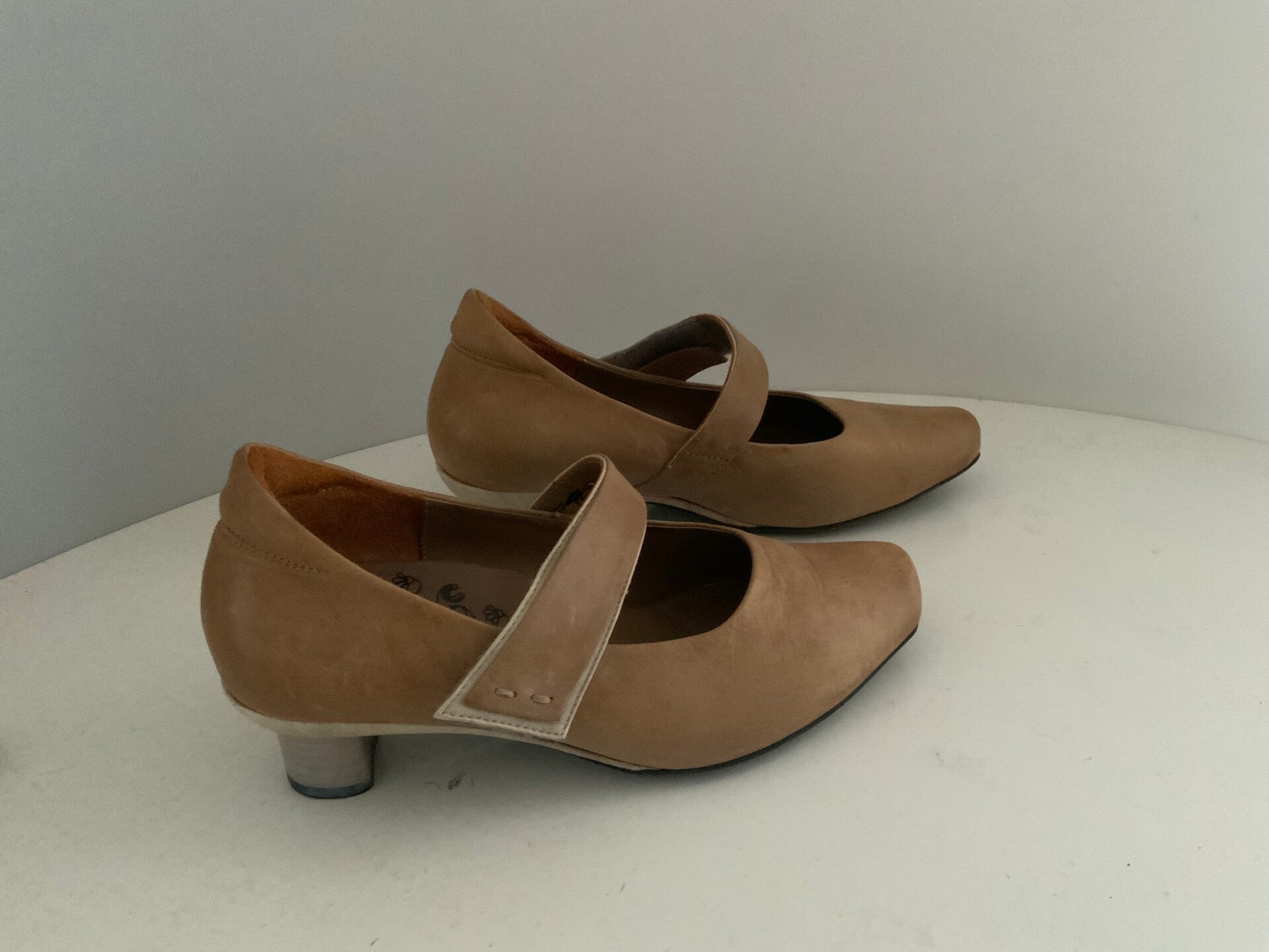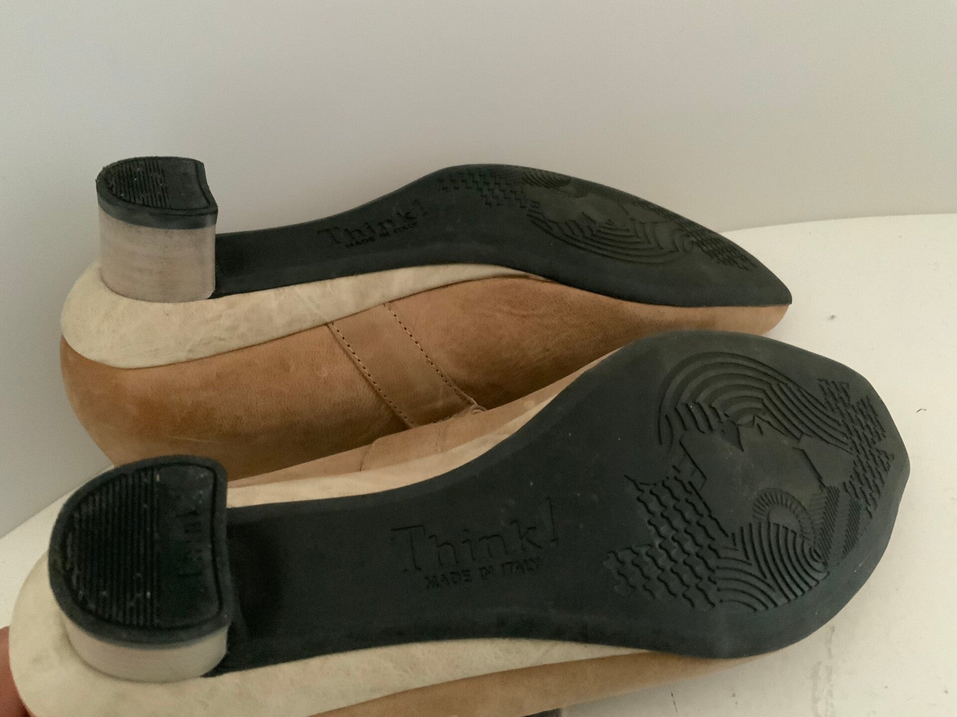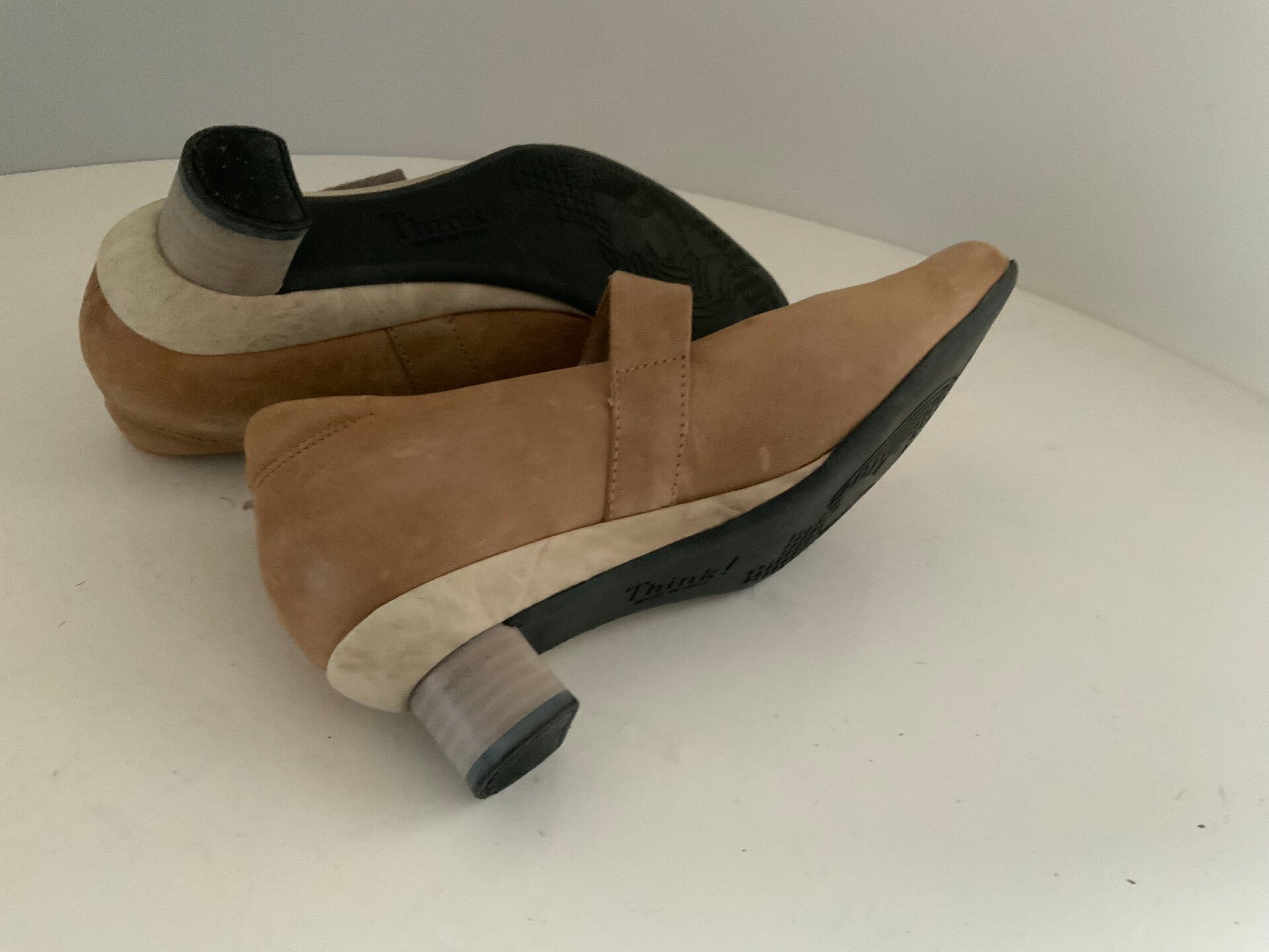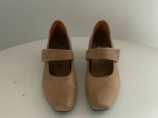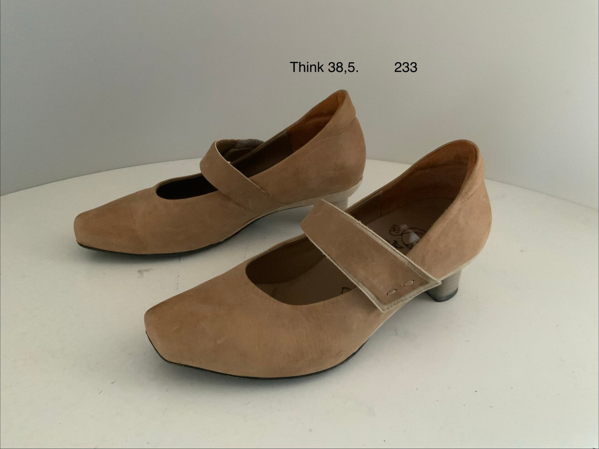 damespumps van het merk Think!. De schoenen hebben een wreefbandje met klittenbandsluiting en zijn uitgevoerd in een beige of zandkleurige leer