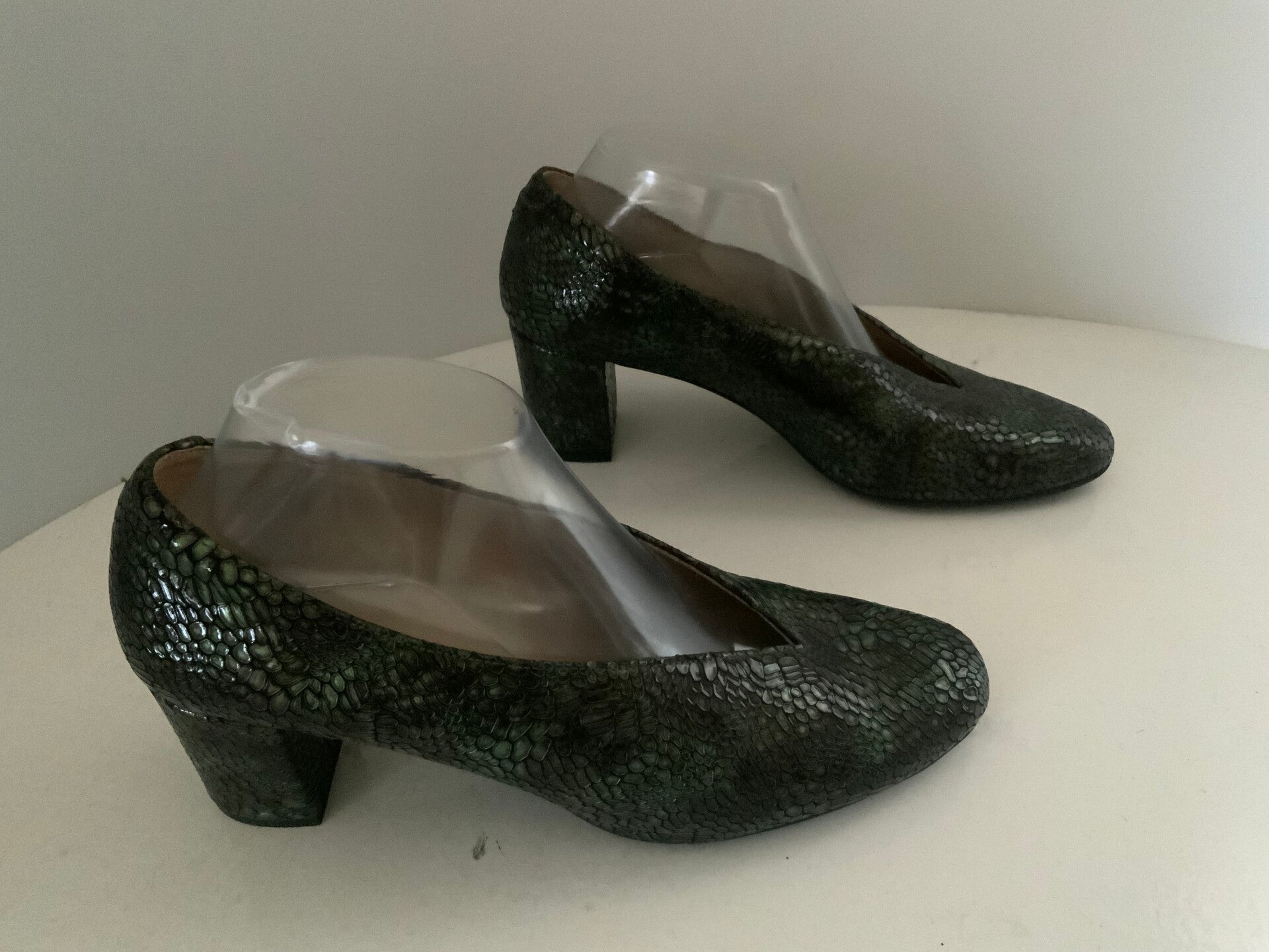 Dit zijn pumps van het merk D'Chicas, specifiek uitgevoerd in een groene slangenleerprint. Het model wordt gekenmerkt door een klassieke v-hals uitsnede en een comfortabele blokhak van circa 4,5 tot 5,5 cm.