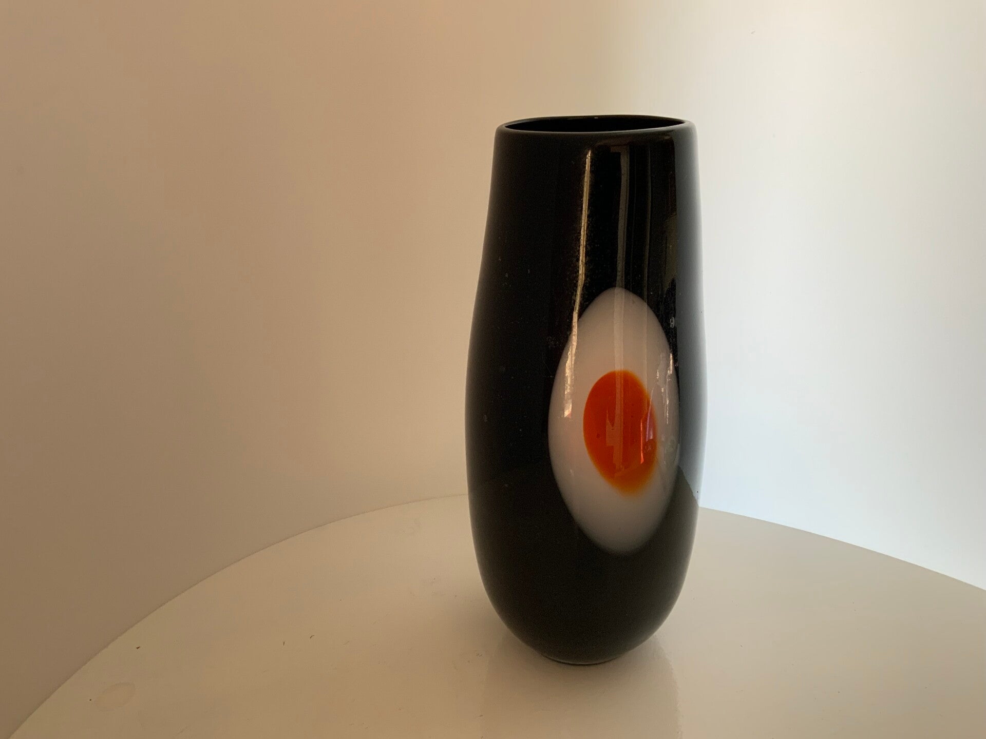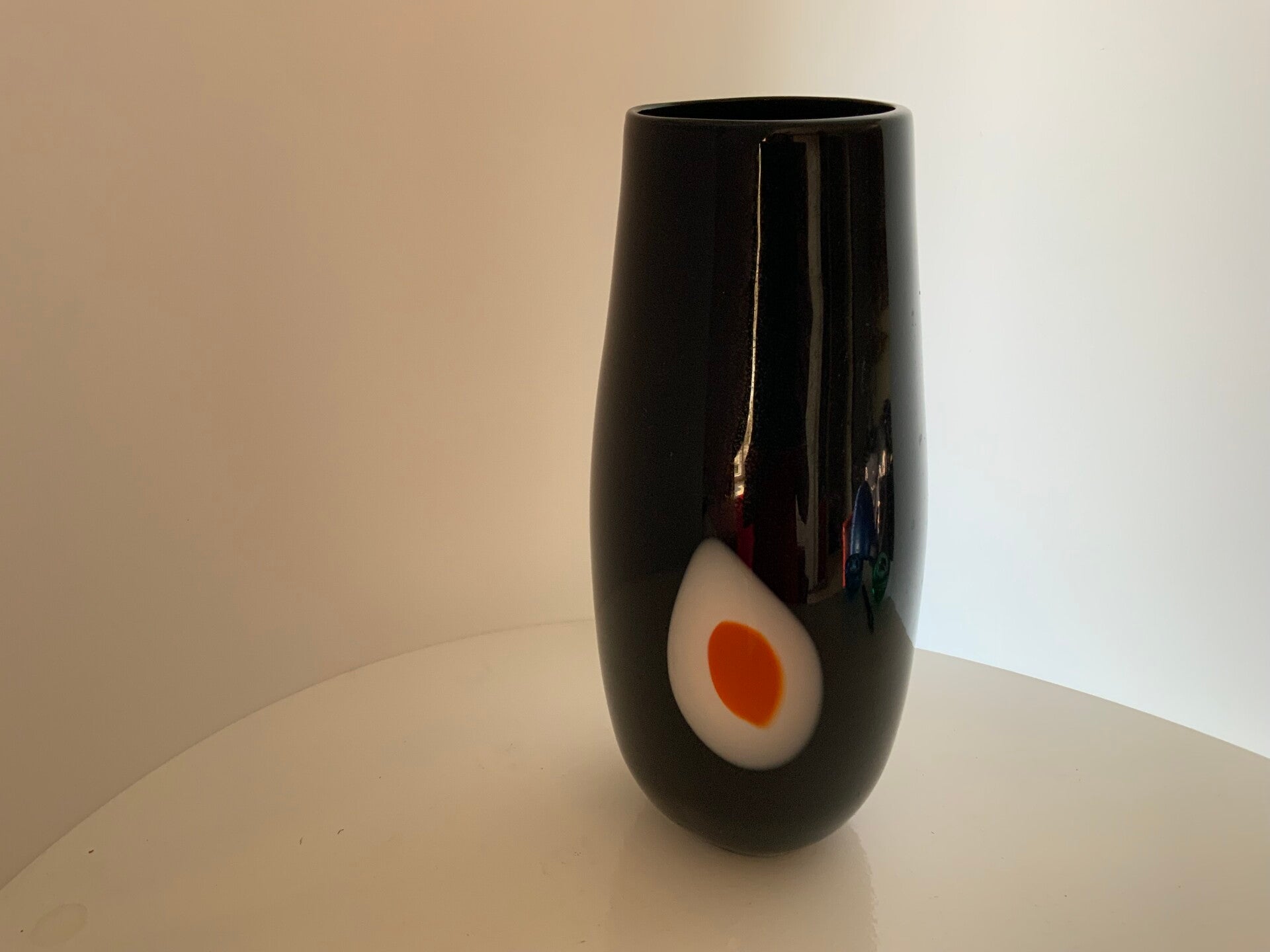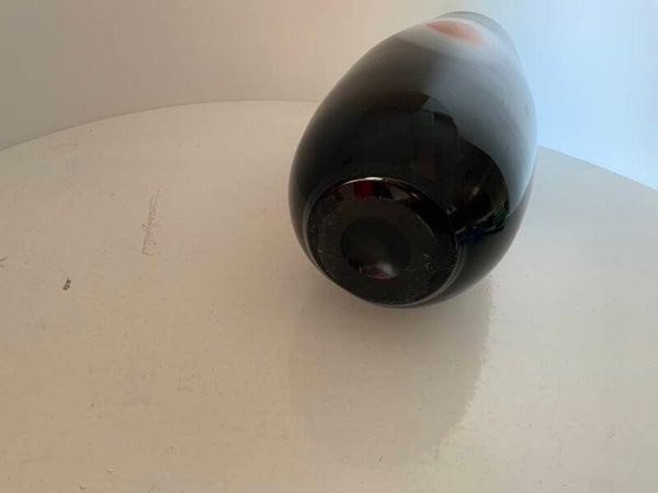Dit object is een handgeblazen Murano glazen "Evil Eye" (boze oog) vaas uit Italië, waarschijnlijk daterend uit de jaren 1960 of 1970. Dit type vaas kenmerkt zich door het zwarte glas met een kenmerkend oogmotief in wit en rood of oranje.
