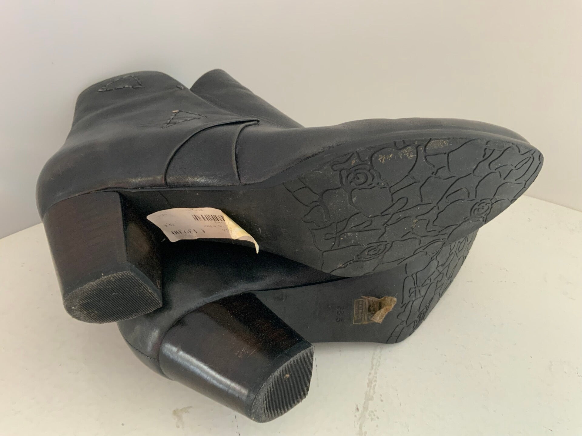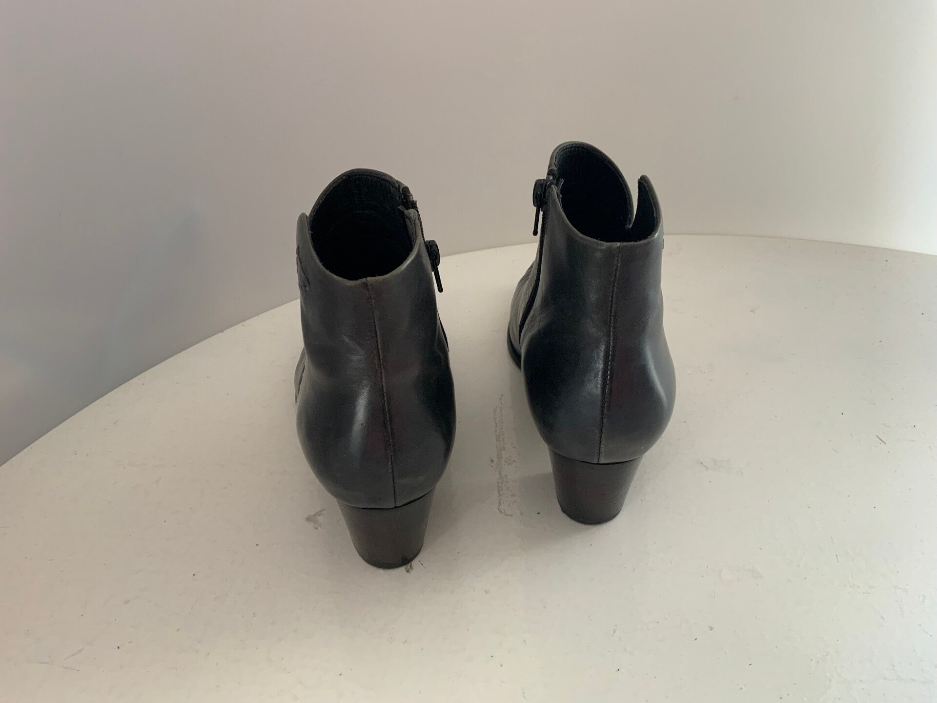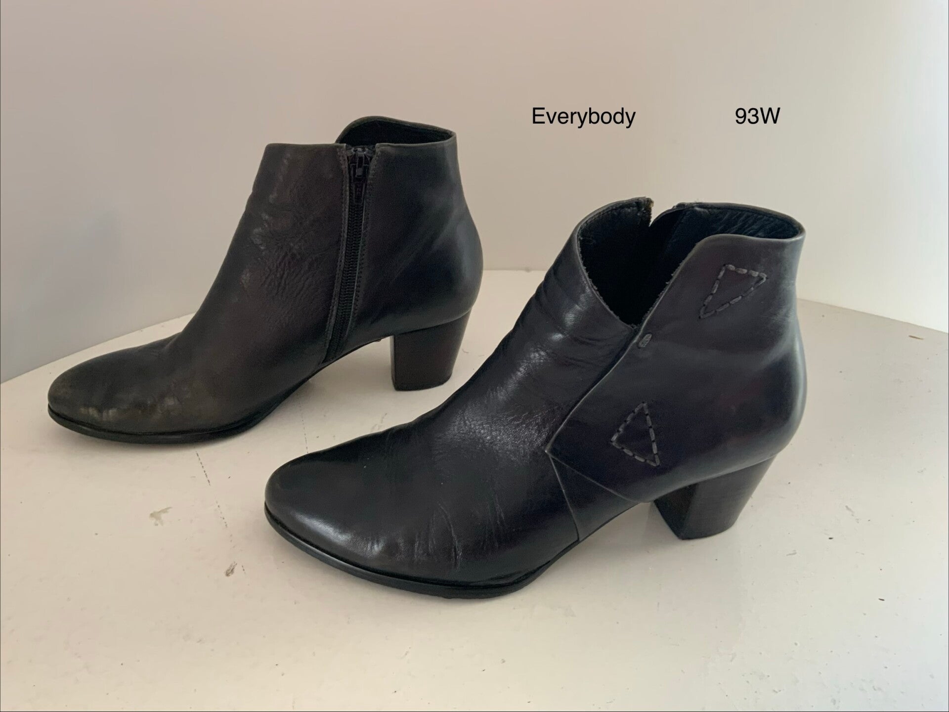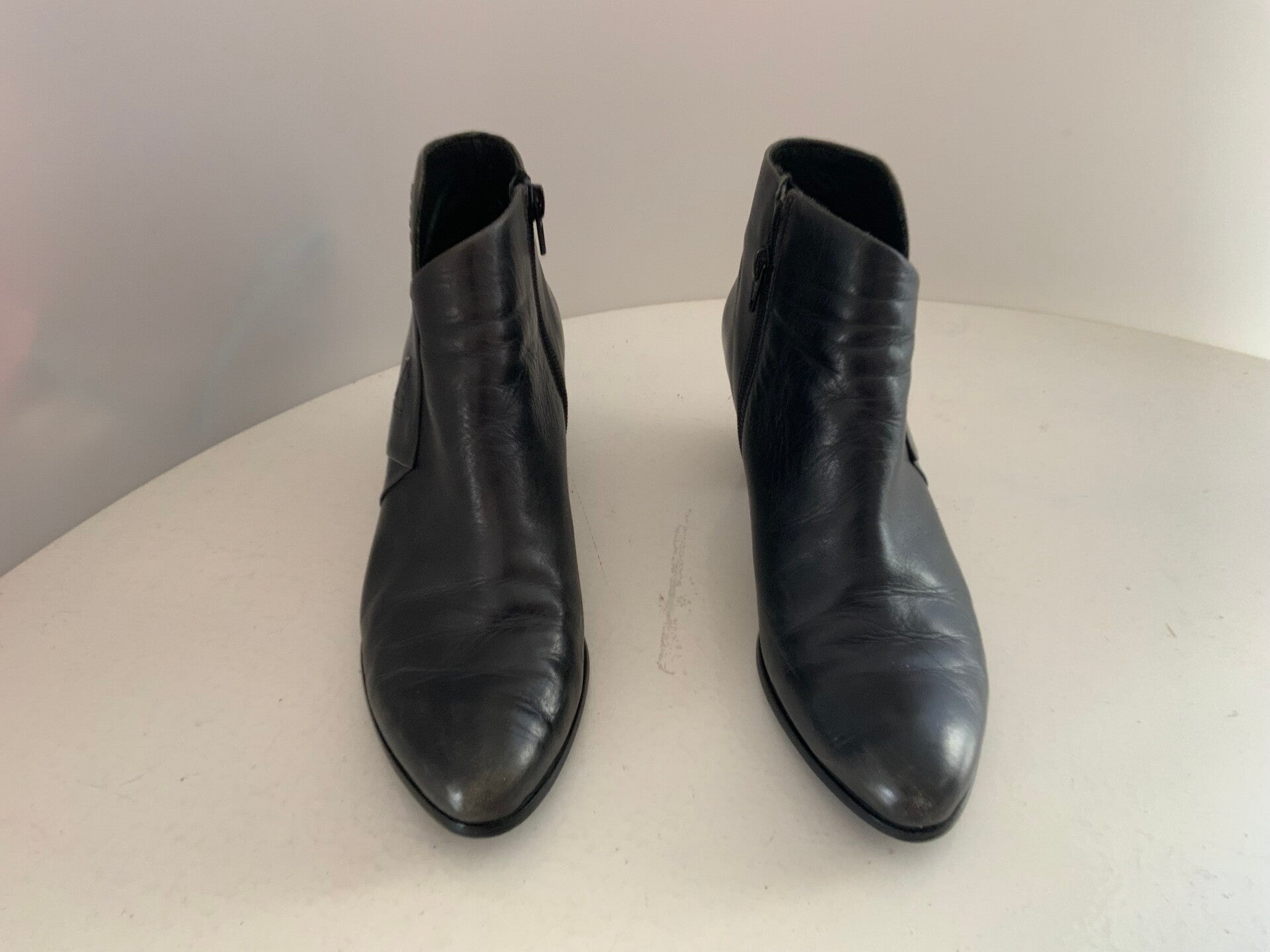 De laarzen hebben een klassiek ontwerp met een spitse tot ronde neus, een middelhoge blokhak voor stabiliteit en een ritssluiting aan de binnenzijde voor gemakkelijk aan- en uittrekken