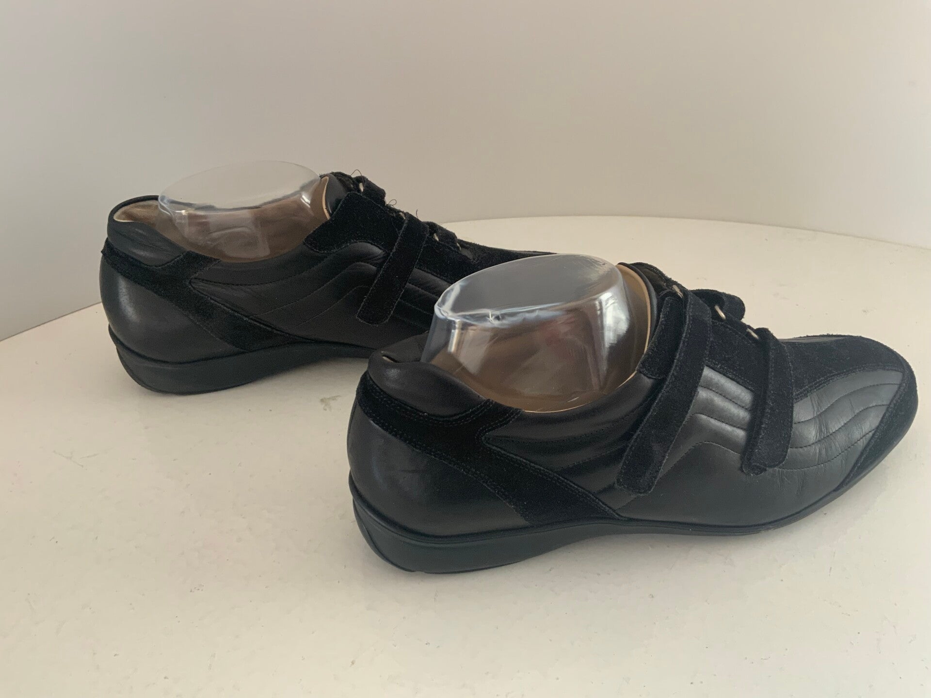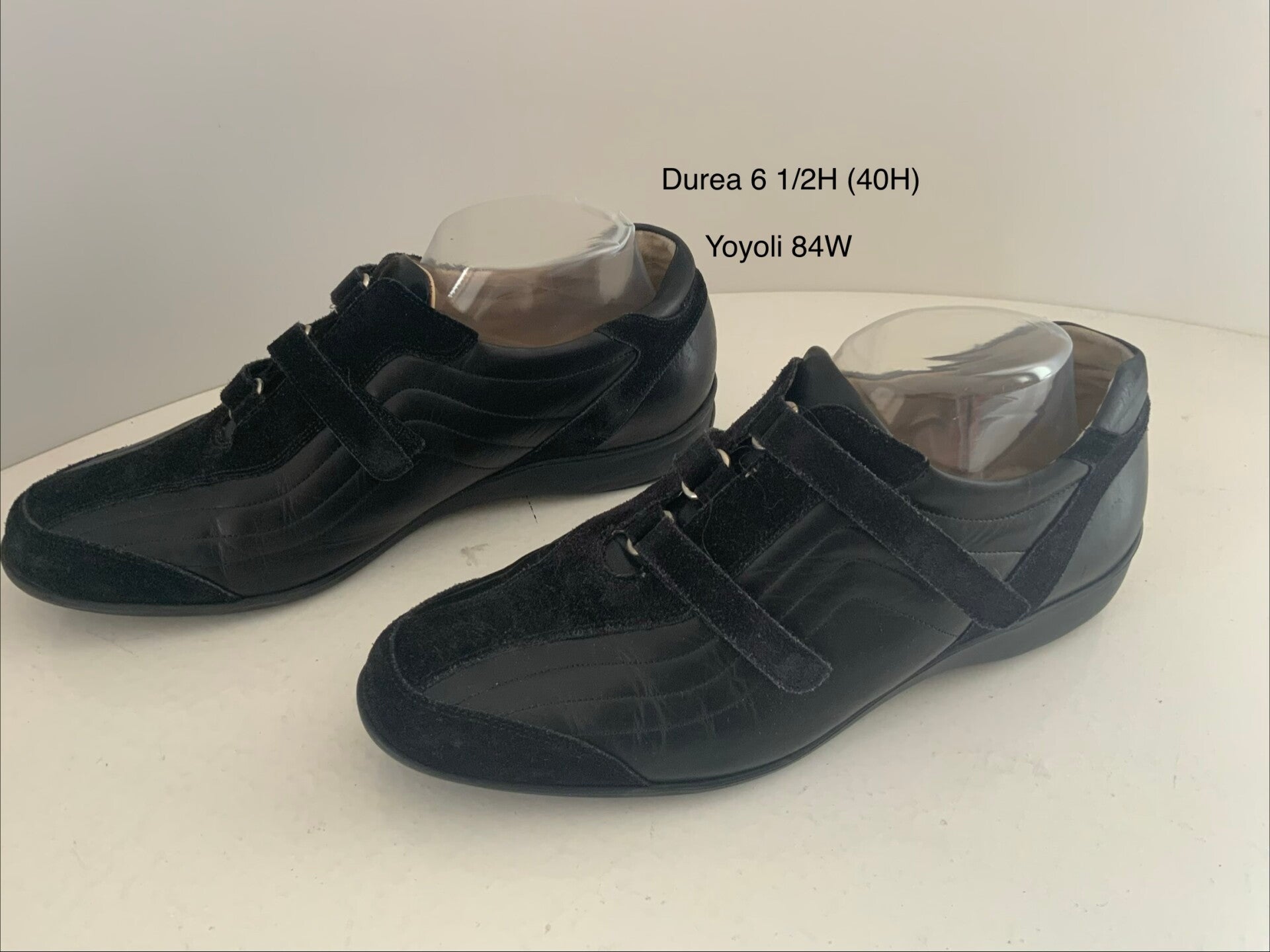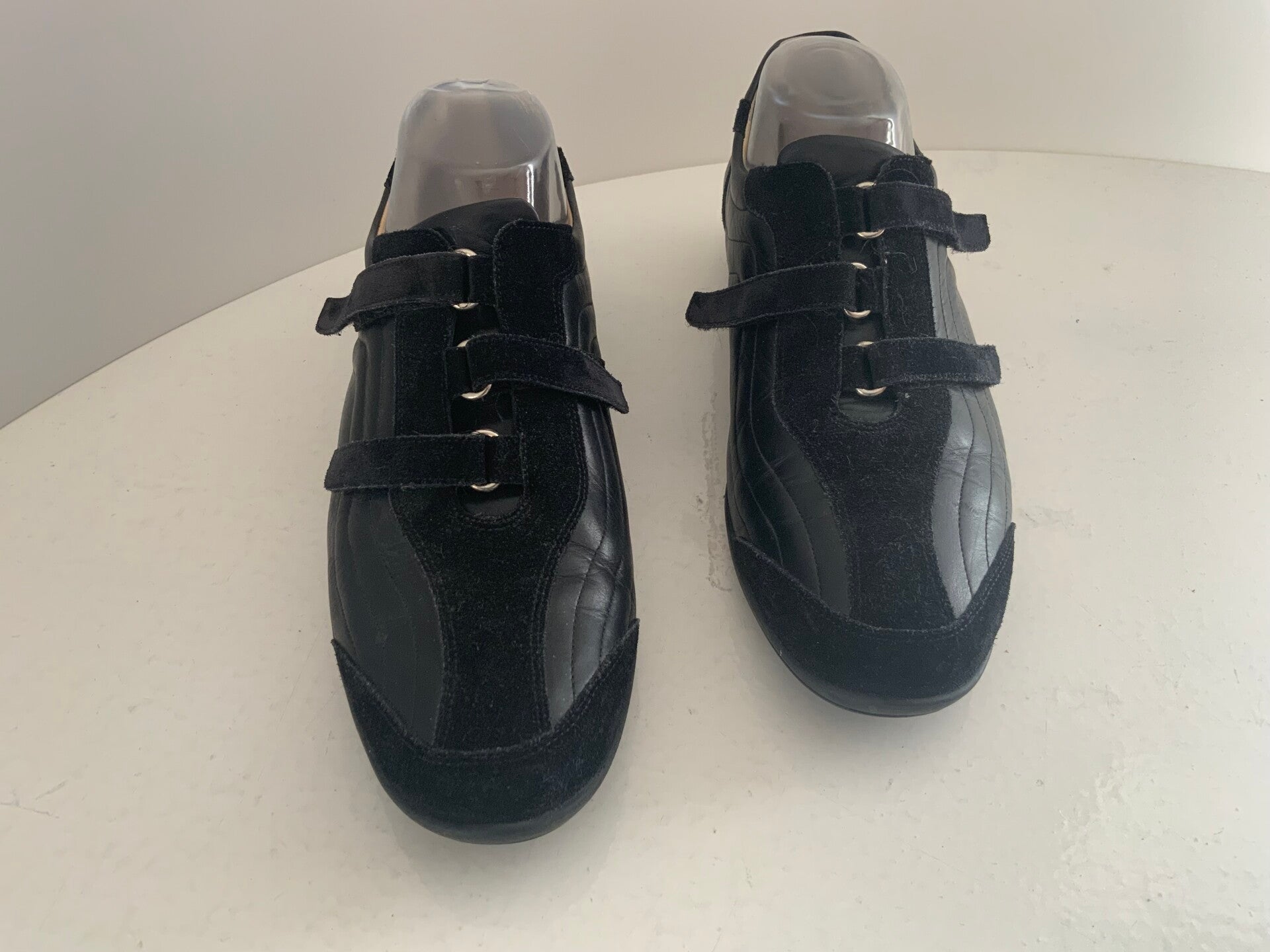 - Kenmerken: De schoenen zijn uitgevoerd in zwart leer en suède, met een handige drie klittenbandsluiting.