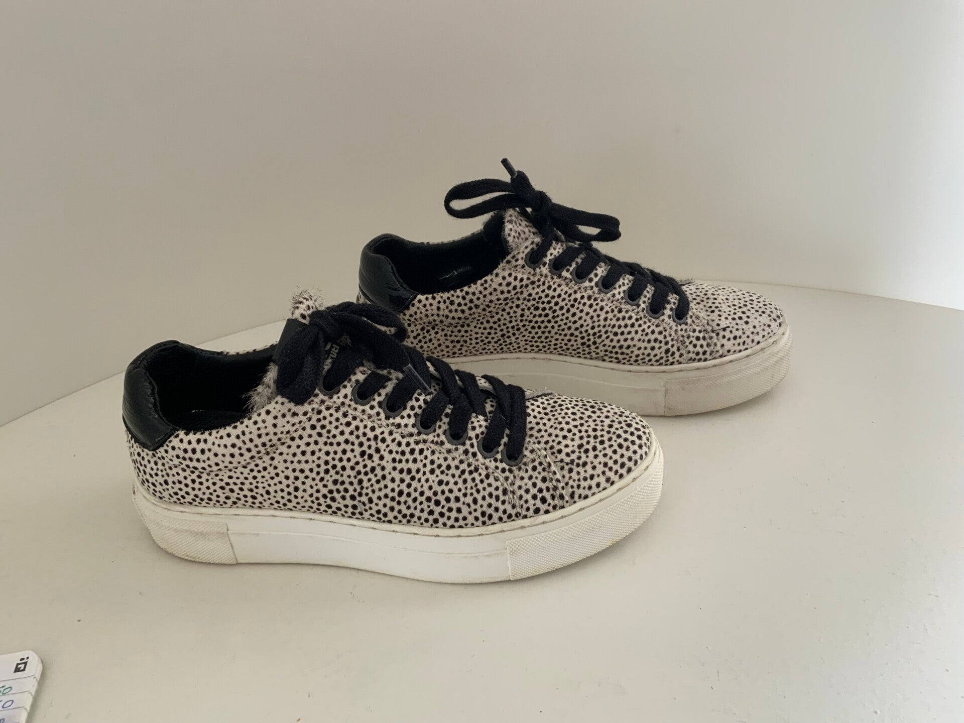 - Materiaal: Het bovenwerk is gemaakt van "hairon" leer, ook wel bekend als ponyhair, met een zwarte pixelprint op een off-white of gebroken witte ondergrond.