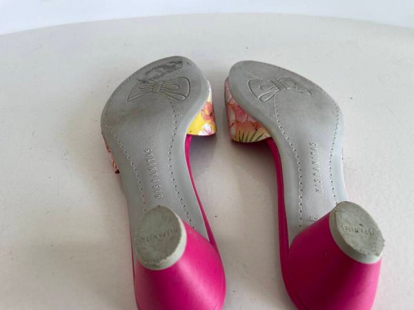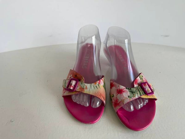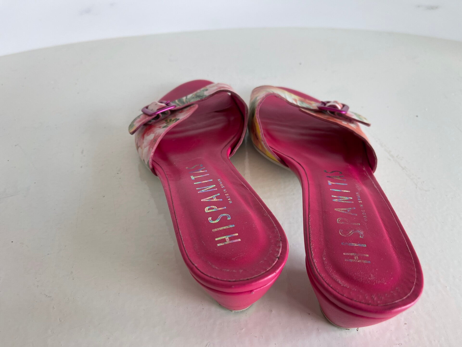 Mooie leren slippers van Hispanitas, maat 41. De slippers hebben een vrolijk bloemenmotief. Ze zijn verstelbaar door middel van een gesp. Het voetbed is gemaakt van leer, wat zorgt voor extra comfort.