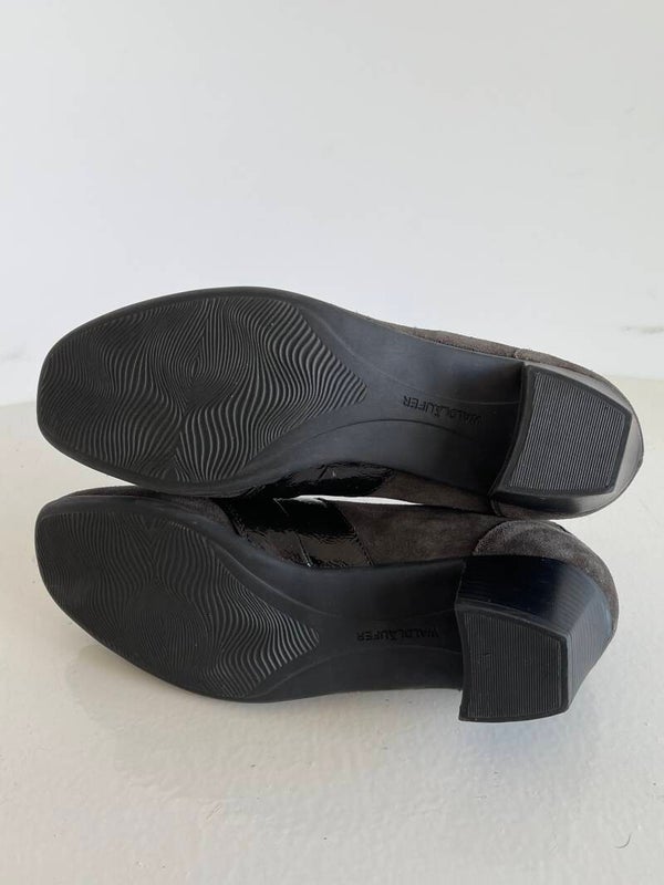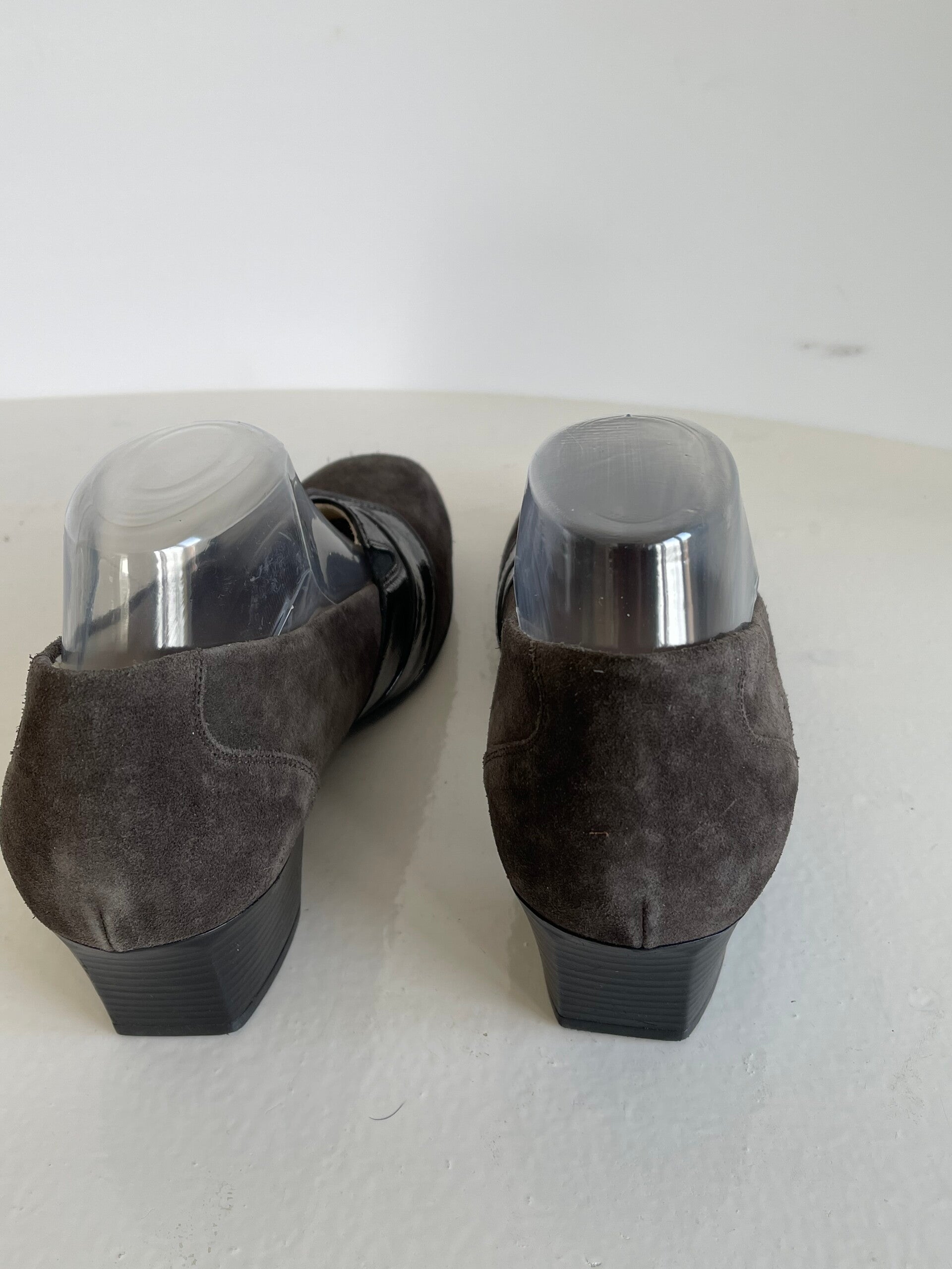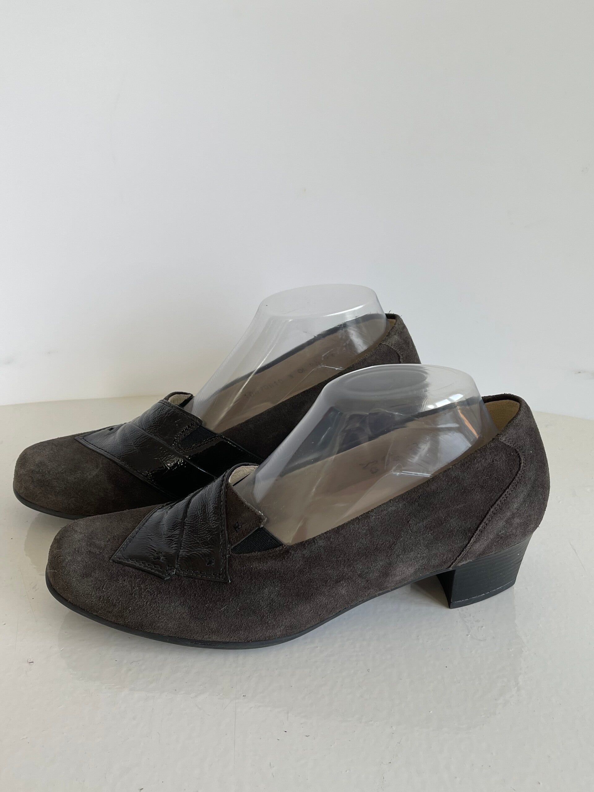 Speciaal voor steunzolenDe schoenen zijn gemaakt van bruine suede leer met een klein stukje lak leerBinenkant van de schoen is van leerLosse zooltjesMet voetbed van leerHakhoogte 4,5 cm