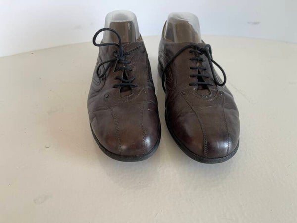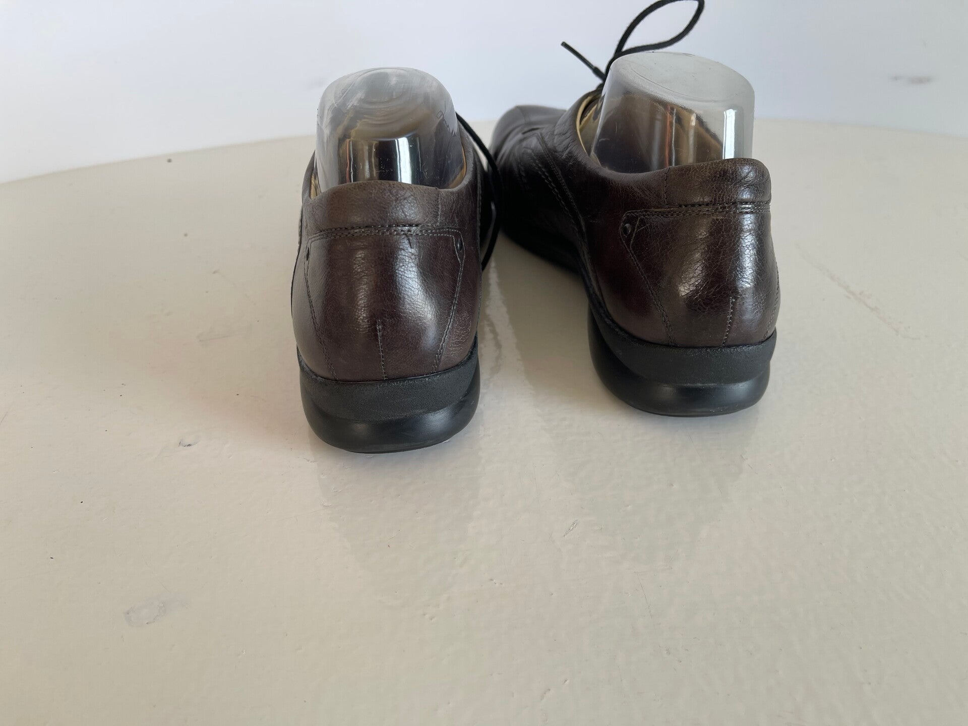Mooie bruine leren instappers van Durea, maat 42 (8H). De schoenen hebben veters en een voering en voetbed van leer. Let op: de losse zolen zijn niet meer aanwezig.