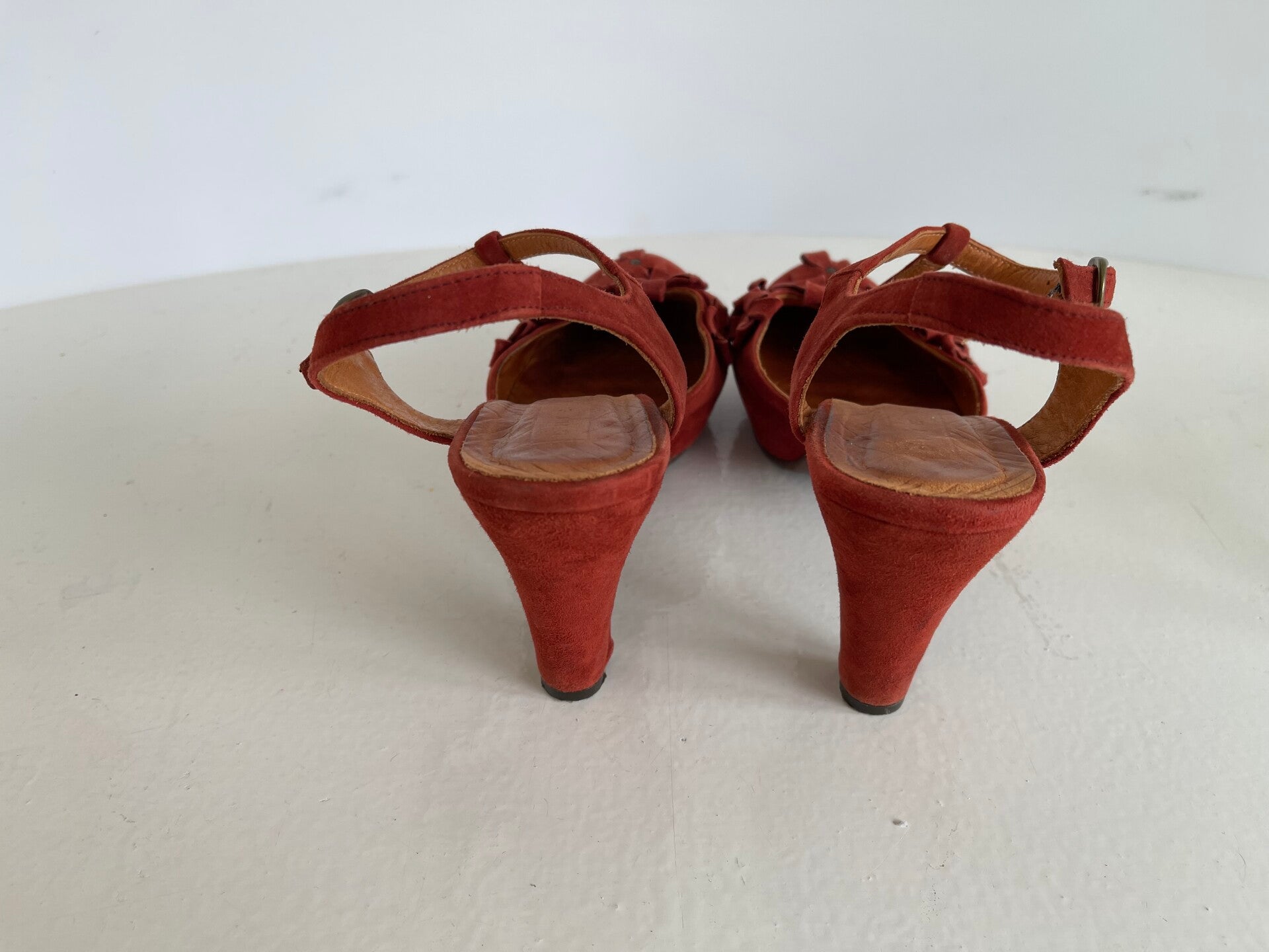 Prachtige bordeaux rode leren pumps van het merk Chie Mihara, maat 40. De schoen heeft een roodbordeaux kleurig leren buitenkant en een bruine leren voering. De plateauhoogte is 2 cm en de hakhoogte is 9,5 cm.